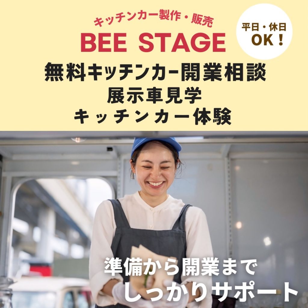 BEE STAGEのキッチンカー開業サポート BEE STAGEのキッチンカー開業個別サポート 販売する商材は何にしよう? 作り方も教えてほしい キッチンカーを実際に経営するにはどうしたらいいのだろう 資金調達はどうしよう などの皆様のご不安やご質問を丁寧にご説明します ビーステージでは実店舗で気軽にじっくりお話しさせて頂きます! キッチンカーの開業無料サポートご相談ください!お問合わせ キッチンカーの開業無料サポートご相談ください!お問合わせ キッチンカーの開業無料サポートご相談ください!お問合わせ
